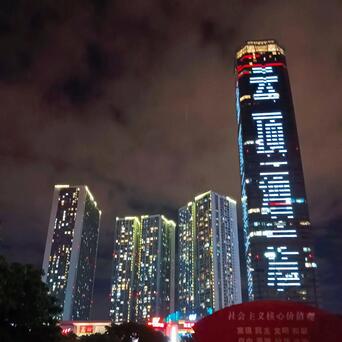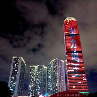 到了夜晚,华灯初上,整个楼栋不断变幻各种颜色,如闪闪的星河,又如美丽的画卷。